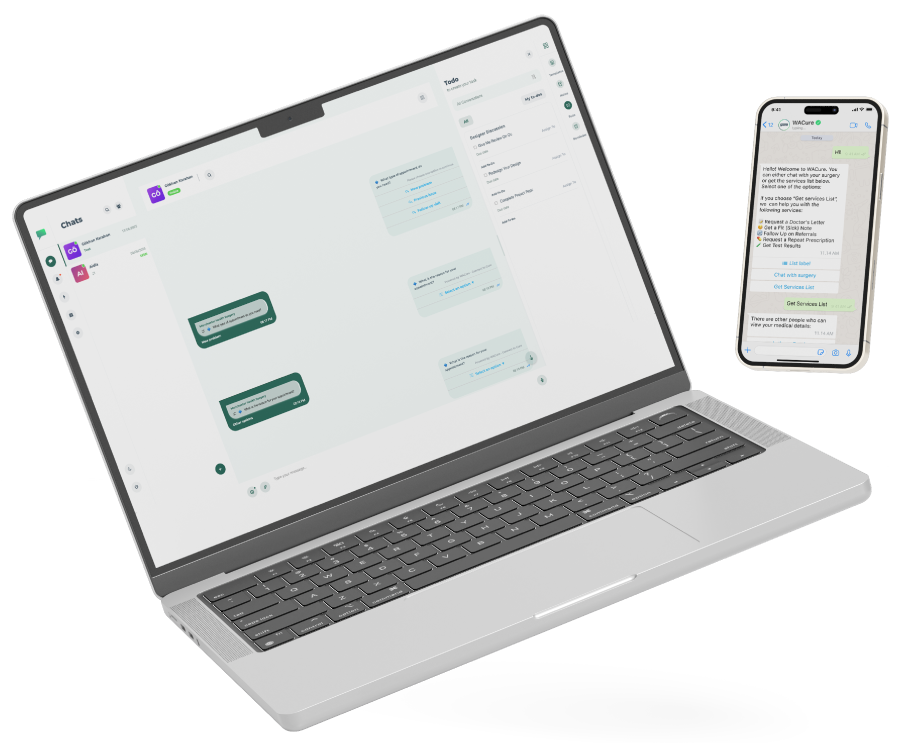 WACure brings patient care to WhatsApp, allowing you to manage appointments, prescriptions, and requests instantly. Patients get faster service with no waiting on hold, while surgeries reduce admin workload and improve efficiency.